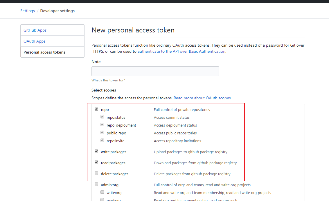 首先需要在Developer settings/Personal access tokens中创建一个token,选择你需要的权限